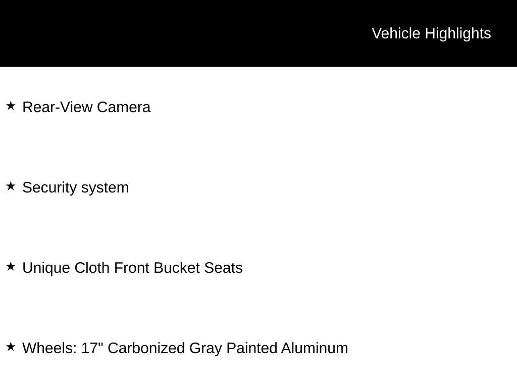 - Unique Cloth Front Bucket Seats and a Rear-View Camera for added comfort and convenience