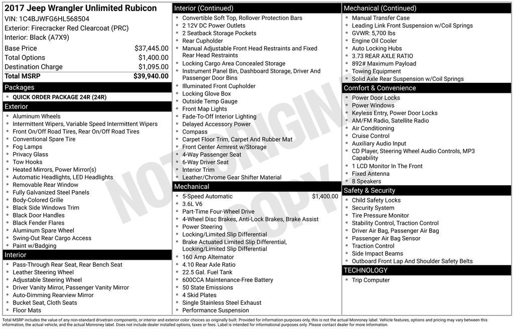 Odometer is 40703 miles below market average! Firecracker Red Clearcoat 2017 Jeep Wrangler Unlimited Rubicon 4WD 5-Speed Automatic 3.6L V6 24V VVT Low Miles!!!, Local Trade!!!, Custom Soft Top, Custom Lift!!!, Oversized Wheels and Tires!!, Custom Steel Bumper with Winch!!!, Wrangler Unlimited Rubicon, 4D Sport Utility, 4WD, Alloy wheels, Audio Jack Input for Mobile Devices, Brake assist, Electronic Stability Control, Front fog lights, Fully automatic headlights, Performance Suspension, Quick Order Package 24R, Radio data system, Remote keyless entry, Security system, Speed control, Steering wheel mounted audio controls, Traction control.