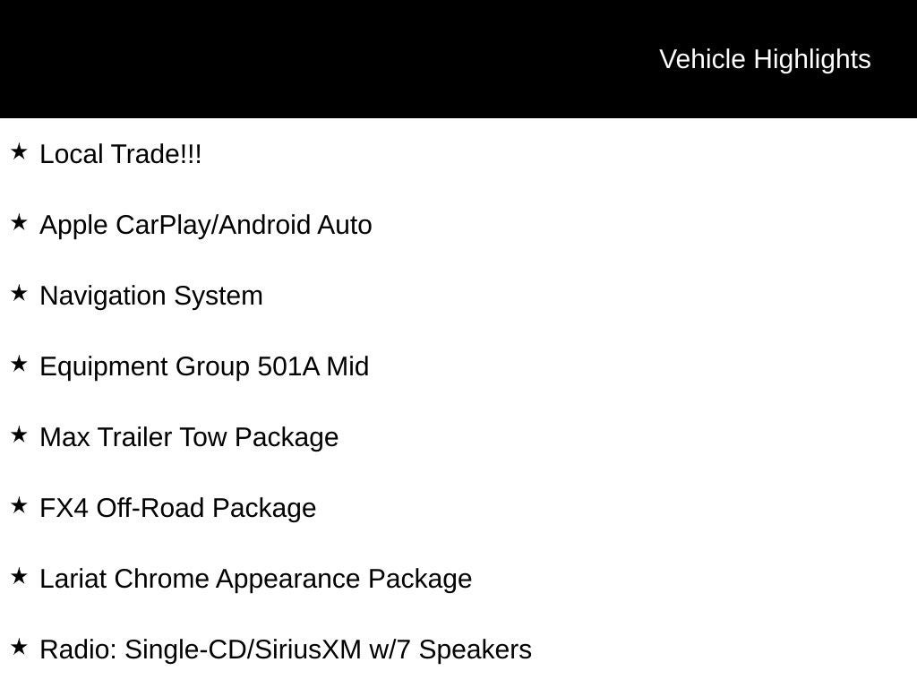 This F-150 Lariat is more than just a capable work truck – it's a true all-around performer. The LARIAT CHROME APPEARANCE PACKAGE adds a touch of refined style with its chrome exterior accents, while the FX4 OFF-ROAD PACKAGE ensures you can confidently tackle any terrain. The MAX TRAILER TOW PACKAGE, with its upgraded towing components, allows you to haul your biggest toys with ease.