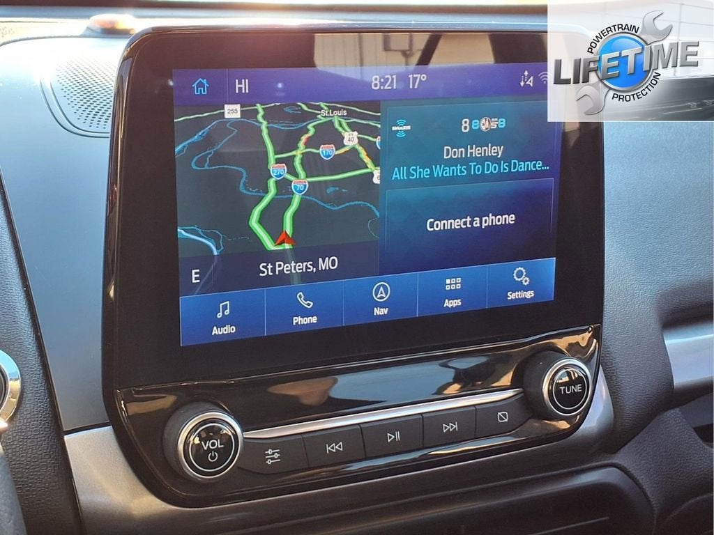 This EcoSport is well equipped with Equipment Group 300A, Alloy wheels, Front Bucket Seats, Heated front seats, Heated steering wheel, Power moonroof, Spoiler, Steering wheel mounted audio controls, Traction control, 3.51 Axle Ratio, 4-Wheel Disc Brakes, 7 Speakers, ABS brakes, ActiveX Seating Material Heated Front Bucket Seats, Air Conditioning, AM/FM radio: SiriusXM, AppLink/Apple CarPlay and Android Auto, Auto-dimming Rear-View mirror, Automatic temperature control, Brake assist, Bumpers: body-color, Compass, Delay-off headlights, Driver door bin, Driver vanity mirror, Dual front impact airbags, Dual front side impact airbags, Electronic Stability Control, Emergency communication system: SYNC 3 911 Assist, Exterior Parking Camera Rear, Front anti-roll bar, Front Center Armrest, Front fog lights, Front reading lights, Front wheel independent suspension, Fully automatic headlights, Heated door mirrors, Illuminated entry, Knee airbag, Leather Shift Knob, Low tire pressure warning, Navigation System, Occupant sensing airbag, Outside temperature display, Overhead airbag, Overhead console, Panic alarm, Passenger door bin, Passenger vanity mirror, Power door mirrors, Power driver seat, Power steering, Power windows, Radio data system, Radio: AM/FM/MP3 Stereo, Rain sensing wipers, Rear anti-roll bar, Rear Parking Sensors, Rear seat center armrest, Rear side impact airbag, Rear window defroster, Rear window wiper, Remote keyless entry, Roof rack: rails only, SiriusXM Radio, SiriusXM Traffic & Travel Link, Speed control, Speed-sensing steering, Split folding rear seat, SYNC 3 Communications & Entertainment System, Tachometer, Telescoping steering wheel, Tilt steering wheel, Trip computer, Turn signal indicator mirrors, Variably intermittent wipers, and Wheels: 17 Black-Painted Aluminum.