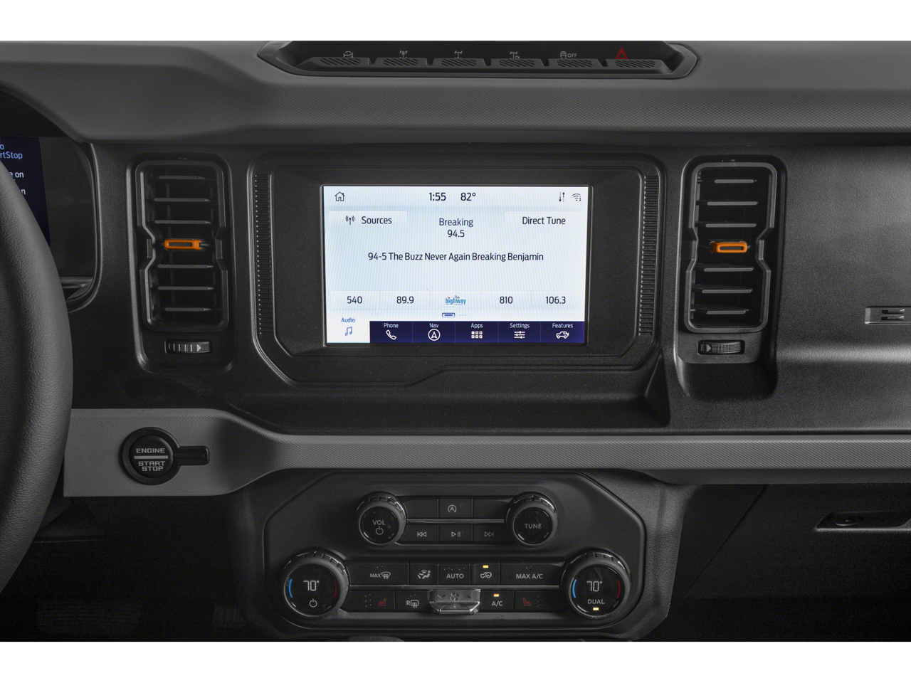 Inside, the Bronco Badlands offers a premium experience with dual-zone electronic automatic temperature control, ambient footwell lighting, and an impressive 12-inch LCD capacitive touchscreen with swipe capability. The front row heated seats and auto-dimming rearview mirror provide added comfort and convenience.