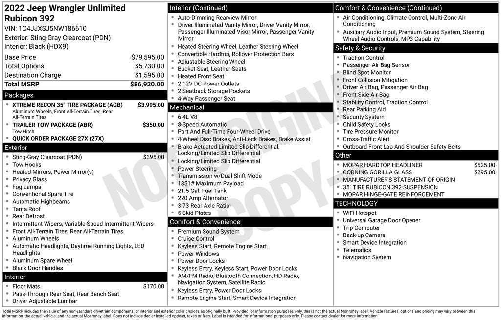 Sting-Gray Clearcoat 2022 Jeep Wrangler Unlimited Rubicon 392 4WD 8-Speed Automatic SRT HEMI 6.4L V8 MDS Low Miles!!!, Apple CarPlay/Android Auto, Clean CarFax!!!!, One Owner CarFax!!!, Wrangler Unlimited Rubicon 392, 4D Sport Utility, SRT HEMI 6.4L V8 MDS, 8-Speed Automatic, 4WD, Sting-Gray Clearcoat, Black Leather, 35 Tire Rubicon 392 Suspension (DISC), 4.56 Rear Axle Ratio (DISC), 7 & 4 Pin Wiring Harness, 9 Speakers, 97 MPH Vehicle Max Speed Calibration, AM/FM radio: SiriusXM, Auto High-beam Headlights, Automatic temperature control, Brake assist, Class II Receiver Hitch, Convertible HardTop, Electronic Stability Control, Front dual zone A/C, Front fog lights, Fully automatic headlights, Heated front seats, Leather Trimmed Bucket Seats, MOPAR Hinge-Gate Reinforcement, Navigation System, ParkView Rear Back-Up Camera, Quick Order Package 27X, Radio data system, Radio: Uconnect 4C Nav w/8.4 Display, Remote keyless entry, Security system, Speed control, Steering wheel mounted audio controls, Traction control, Trailer Tow Package, Variably intermittent wipers, Wheel Flare Extensions, Wheels: 17 x 8 Bronze Beadlock Capable (DISC), Xtreme Recon 35 Tire Package (DISC).