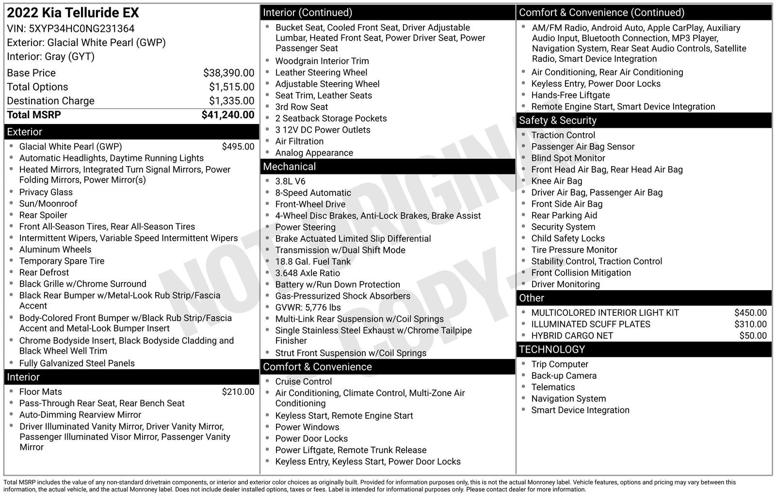 ** Third Row **, Telluride EX, 4D Sport Utility, Gray w/Leather Seat Trim, 3rd row seats: split-bench, AM/FM radio: SiriusXM, Apple CarPlay & Android Auto, Brake assist, Electronic Stability Control, Four wheel independent suspension, Fully automatic headlights, Heated & Ventilated Front Bucket Seats, Leather Seat Trim, Navigation System, Power driver seat, Power Liftgate, Power moonroof, Power passenger seat, Radio: AM/FM Display Audio System, Rear air conditioning, Remote keyless entry, Security system, Smart Key w/ Push Button and Remote Start, Speed control, Steering wheel mounted audio controls, Traction control, Wheels: 18 x 7.5 Machined Alloy, 3.648 Axle Ratio, 4-Wheel Disc Brakes, 6 Speakers, ABS brakes, Air Conditioning, Auto-dimming Rear-View mirror, Automatic temperature control, Bumpers: body-color, Carpeted Floor Mats, Compass, Delay-off headlights, Driver door bin, Driver vanity mirror, Dual front impact airbags, Dual front side impact airbags, Emergency communication system: 911 Connect, Front anti-roll bar, Front Bucket Seats, Front Center Armrest, Front dual zone A/C, Front reading lights, Heated door mirrors, Heated front seats, Hybrid Cargo Net, Illuminated entry, Illuminated Scuff Plates, Knee airbag, Leather Shift Knob, Leather steering wheel, Low tire pressure warning, Multicolored Interior Light Kit, Occupant sensing airbag, Outside temperature display, Overhead airbag, Overhead console, Panic alarm, Passenger door bin, Passenger vanity mirror, Power door mirrors, Power steering, Power windows, Radio data system, Rear anti-roll bar, Rear audio controls, Rear reading lights, Rear seat center armrest, Rear window defroster, Rear window wiper, Reclining 3rd row seat, Roof rack: rails only, Speed-sensing steering, Split folding rear seat, Spoiler, Tachometer, Telescoping steering wheel, Tilt steering wheel, Trip computer, Turn signal indicator mirrors, Variably intermittent wipers, Ventilated front seats, 1 Owner CarFax!, Low Miles!!!, Telluride EX, 4D Sport Utility, Gray w/Leather Seat Trim, 3rd row seats: split-bench, AM/FM radio: SiriusXM, Apple CarPlay & Android Auto, Brake assist, Electronic Stability Control, Four wheel independent suspension, Fully automatic headlights, Heated & Ventilated Front Bucket Seats, Leather Seat Trim, Navigation System, Power driver seat, Power Liftgate, Power moonroof, Power passenger seat, Radio: AM/FM Display Audio System, Rear air conditioning, Remote keyless entry, Security system, Smart Key w/ Push Button and Remote Start, Speed control, Steering wheel mounted audio controls, Traction control, Wheels: 18 x 7.5 Machined Alloy. 20/26 City/Highway MPG