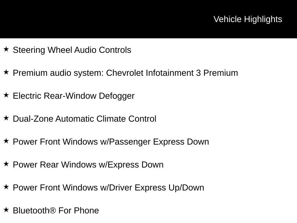 - Convenience Package includes (CJ2) dual-zone automatic climate control, (A2X) 10-way power driver seat including power lumbar, (KA1) heated driver and passenger seats, (N57) wrapped steering wheel, (KI3) heated steering wheel, (KI4) 120-volt power outlet, (KC9) 120-volt bed-mounted power outlet, (UBI) 2 charge-only USB ports for second row, (C49) rear-window defogger, (AVJ) Keyless Open and Start, (BTV) Remote Start and (UTJ) content theft alarm. (Upgradeable to (A50) bucket seats and includes (D07) center console.) (Upgradeable to (A50) bucket seats and includes (D07) center console. Deleted when (RG4) Fleet LT Base Content Package Delete is ordered.)