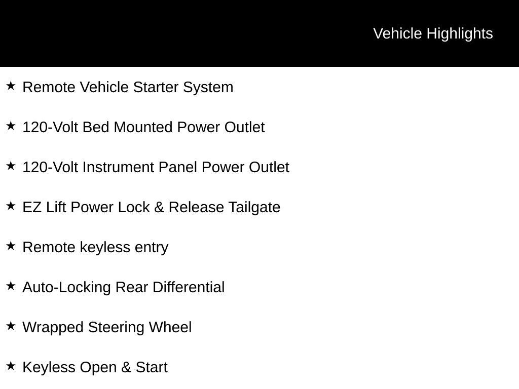 - LED Cargo Area Lighting located in pickup bed, activated with switch on center switch bank or key fob (Deleted when (RG4) Fleet LT Base Content Package Delete is ordered.)