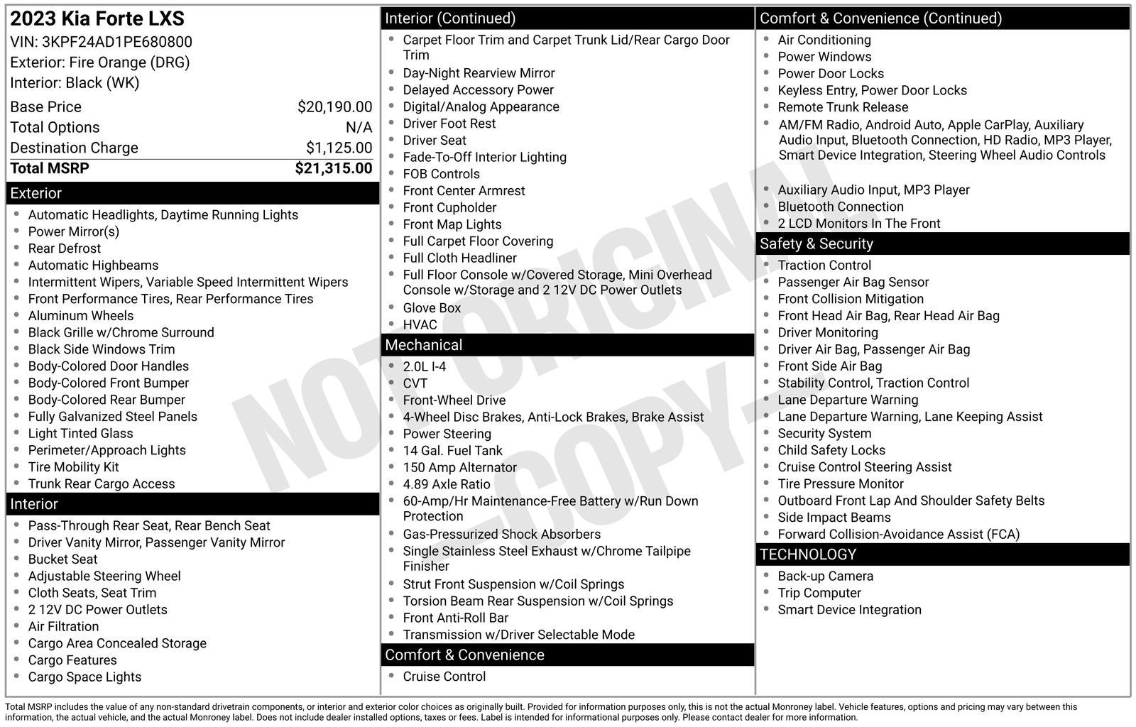 Forte LXS, 2.0L I4 MPI, Fire Orange, 16 x 6.5J Alloy Wheels, Apple CarPlay & Android Auto, Exterior Parking Camera Rear, Radio: 8 Display Audio, Remote keyless entry, Security system, Split folding rear seat, 4 Speakers, 4-Wheel Disc Brakes, ABS brakes, Air Conditioning, Alloy wheels, AM/FM radio, Auto High-beam Headlights, Brake assist, Bumpers: body-color, Cloth Seat Trim, Delay-off headlights, Driver door bin, Driver vanity mirror, Dual front impact airbags, Dual front side impact airbags, Electronic Stability Control, Front anti-roll bar, Front Bucket Seats, Front Center Armrest, Front reading lights, Front wheel independent suspension, Fully automatic headlights, Illuminated entry, Low tire pressure warning, Occupant sensing airbag, Outside temperature display, Overhead airbag, Overhead console, Panic alarm, Passenger door bin, Passenger vanity mirror, Power door mirrors, Power steering, Power windows, Radio data system, Rear window defroster, Speed control, Steering wheel mounted audio controls, Tachometer, Telescoping steering wheel, Tilt steering wheel, Traction control, Trip computer, Variably intermittent wipers, 1 Owner CarFax!, Forte LXS, 2.0L I4 MPI, Fire Orange, 16 x 6.5J Alloy Wheels, Apple CarPlay & Android Auto, Exterior Parking Camera Rear, Radio: 8 Display Audio, Remote keyless entry, Security system, Split folding rear seat. 28/39 City/Highway MPG