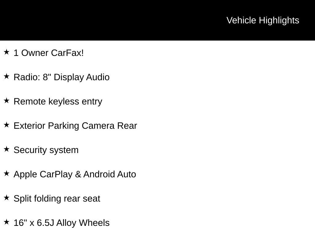 - Radio: 8" Display Audio -inc: 4 speakers, 8" touch screen, HD radio, wireless Apple CarPlay and Android Auto, Bluetooth hands-free and USB input