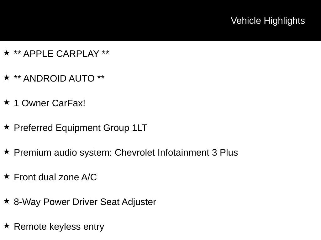 - Audio system, Chevrolet Infotainment 3 system, 8" diagonal color touchscreen, AM/FM stereo. Additional features for compatible phones include: Bluetooth audio streaming for 2 active devices, voice command pass-through to phone, Apple CarPlay and Android Auto capable.