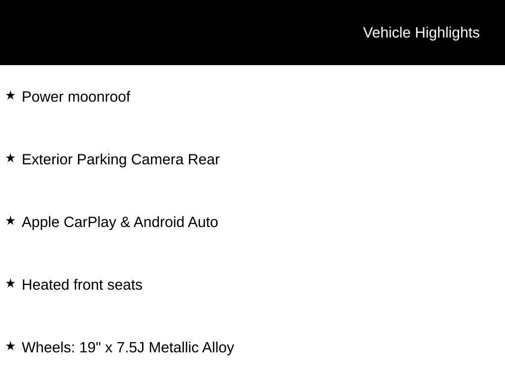 - Wheels: 19 x 7.5J Metallic Alloy