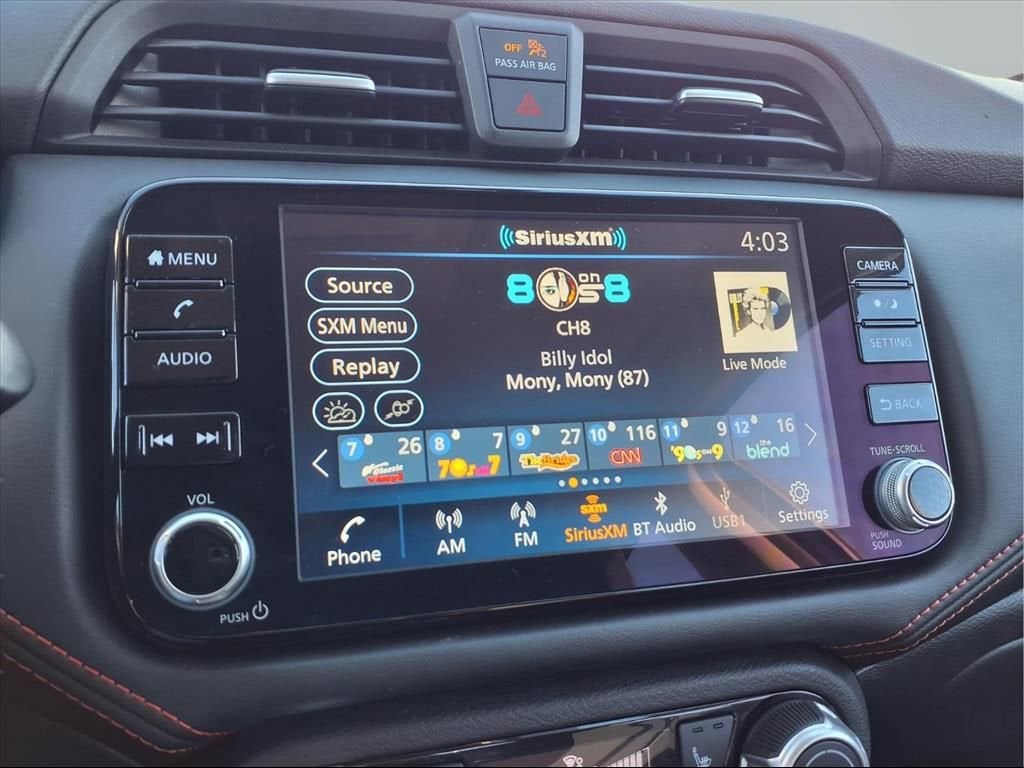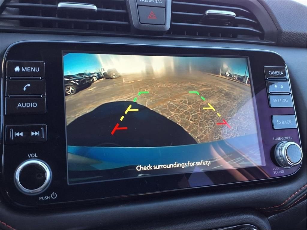 This Versa is well equipped with Alloy wheels, Apple CarPlay/Android Auto, Blind Spot Warning, Remote keyless entry, Speed control, Steering wheel mounted audio controls, 17 Aluminum Alloy Wheels, 6 Speakers, ABS brakes, Air Conditioning, AM/FM radio: SiriusXM, Auto High-beam Headlights, Automatic temperature control, Brake assist, Bumpers: body-color, Carpeted Floor Mats & Trunk Mat (5-Piece Set), Delay-off headlights, Driver door bin, Driver vanity mirror, Dual front impact airbags, Dual front side impact airbags, Electronic Stability Control, Emergency communication system, Front anti-roll bar, Front Bucket Seats, Front Center Armrest, Front reading lights, Front wheel independent suspension, Fully automatic headlights, Heated door mirrors, Heated Front Bucket Seats, Heated front seats, Illuminated entry, Knee airbag, Leather steering wheel, Low tire pressure warning, Occupant sensing airbag, Outside temperature display, Overhead airbag, Panic alarm, Passenger door bin, Passenger vanity mirror, Power door mirrors, Power steering, Power windows, Radio data system, Radio: AM/FM Audio System, Rear Parking Sensors, Rear side impact airbag, Rear window defroster, Split folding rear seat, Spoiler, SR Fabric Seat Trim, Tachometer, Telescoping steering wheel, Tilt steering wheel, Traction control, Trip computer, Turn signal indicator mirrors, and Variably intermittent wipers.