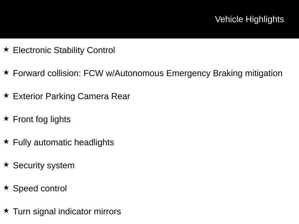 - Forward collision: FCW w/Autonomous Emergency Braking mitigation