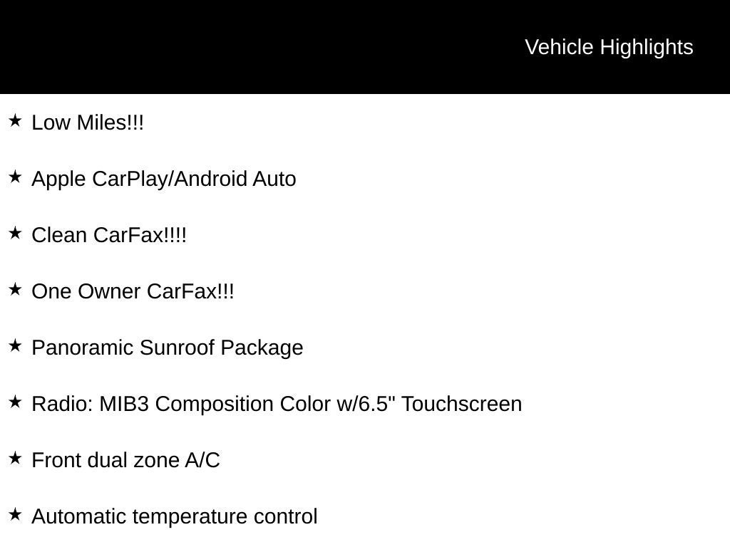 - Radio: MIB3 Composition Color w/6.5" Touchscreen -inc: AM/FM radio w/USB-C, Bluetooth connectivity (for compatible devices), capability for in-vehicle 4G LTE enabled Wi-Fi (cellular data plan required; includes limited trial), capability for VW Car-Net services (capabilities for certain services vary; requires enrollment or subscription), App-Connect smartphone integration (w/Apple CarPlay, Android Auto and MirrorLink) via USB and USB-C enhanced charging, up to 45W (for compatible devices)