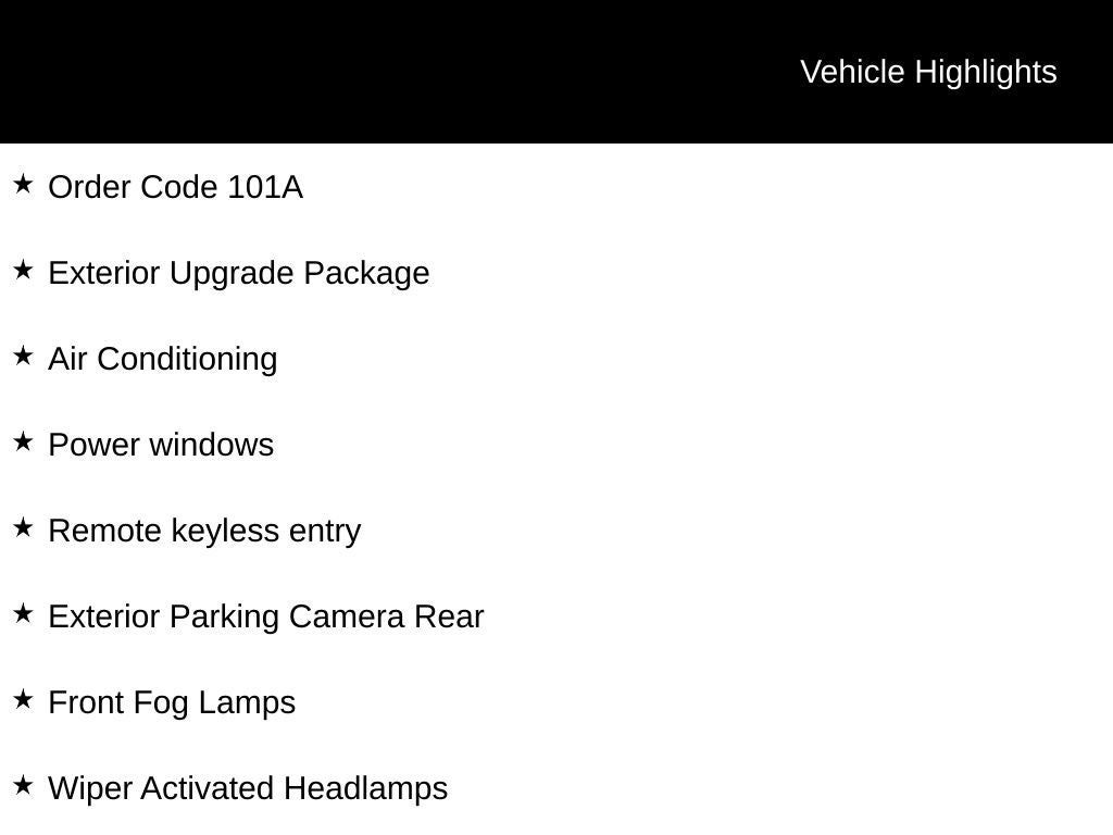- Air Conditioning, Power Windows, Remote Keyless Entry, and Front Fog Lamps